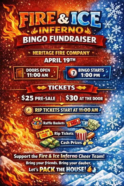 There will be a Fire & Ice Inferno Bingo Fundraiser held on Sunday, April 19th at the Heritage Fire Company in Lewistown. Doors open at 11AM and Bingo starts at 1PM.