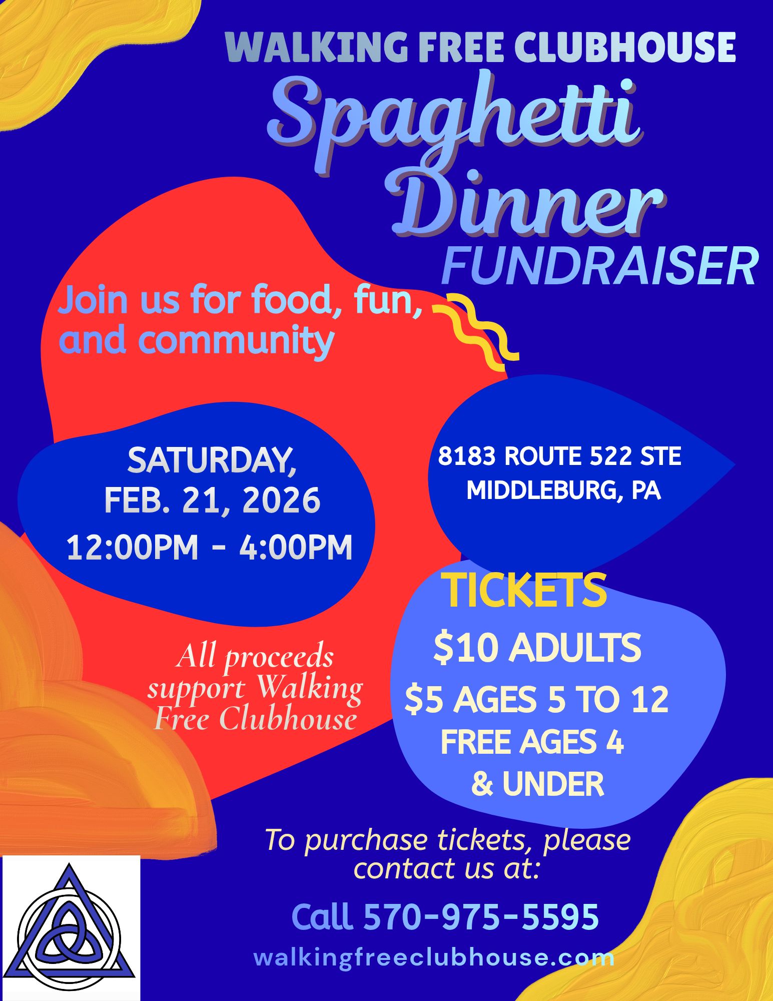 The Walking Free Clubhouse is hosting a Spaghetti Dinner Fundraiser at 8183 Route 522 Middleburg on Saturday, February 21st from Noon to 4PM.